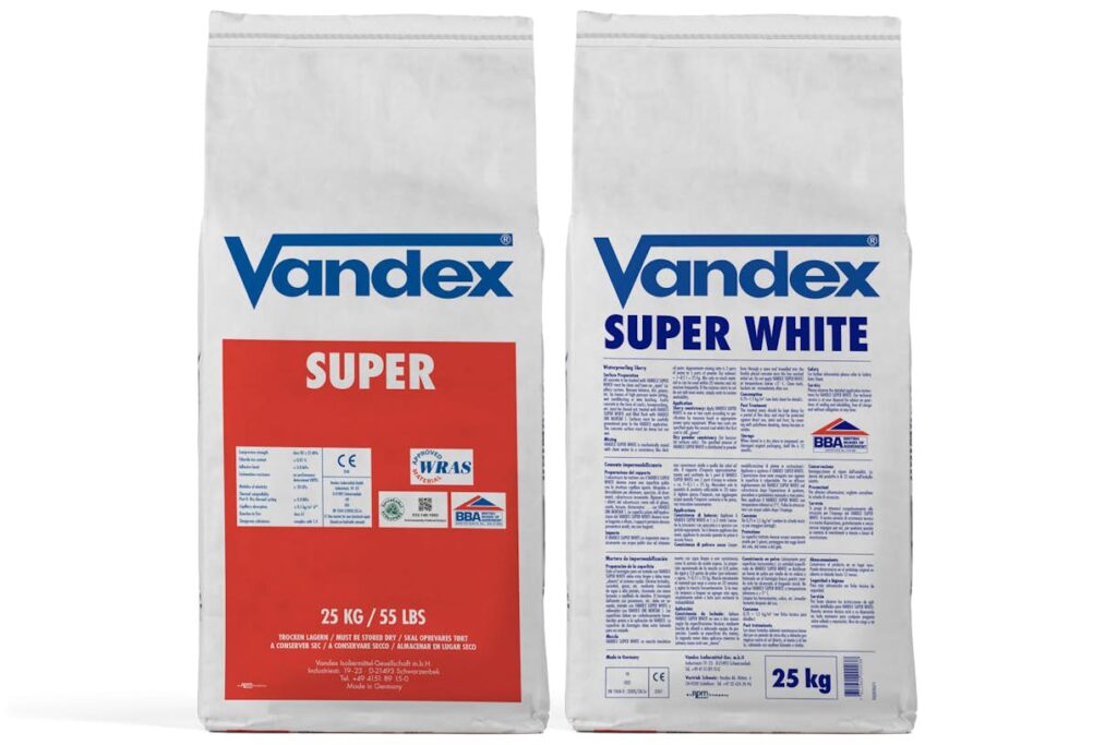 Khi VANDEX SUPER được thi công lên bề mặt bê tông, các hóa chất hoạt tính kết hợp với vôi tự do và hơi ẩm có trong đường mao dẫn tạo thành các phức tinh thể không hòa tan. Những tinh thể này chặn các mao mạch và các vết nứt co ngót nhỏ trong bê tông để ngăn nước xâm nhập thêm (ngay cả dưới áp lực). Tuy nhiên, lớp Vandex vẫn sẽ cho phép hơi nước đi qua kết cấu (tức là bê tông vẫn có thể “thở”). Ngoài việc chống thấm cho kết cấu, VANDEX SUPER còn bảo vệ bê tông khỏi nước biển, nước thải, nước ngầm có tính ăn mòn cao và một số dung dịch hóa học nhất định.ý kiến. VANDEX SUPER được thử nghiệm để sử dụng khi tiếp xúc với nước uống.